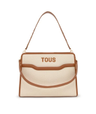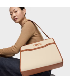 Bolso shopper mediano Audree Canvas de algodón con detalles de poliuretano y piel vacuna con certificación LWG en color camel. Cierre magnético. Dos compartimentos separados por uno con cremallera. Bolsillo interior y bolsillo exterior abiertos. Asa de hombro desmontable. Medidas (alto x ancho x fondo): 26 x 33,5 x 13,5 cm.